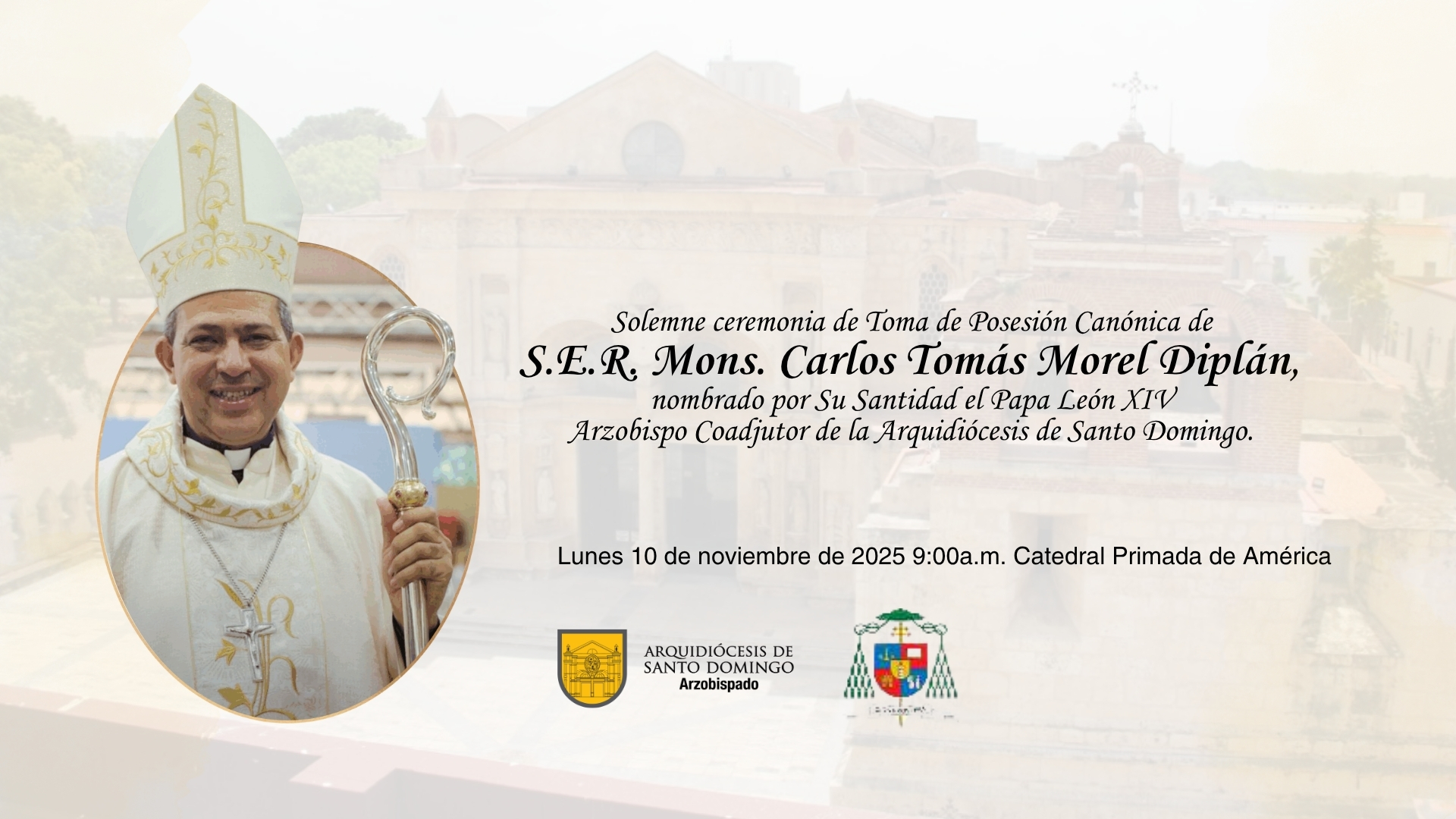 La Arquidiócesis de Santo Domingo tiene el honor de invitar al Pueblo de Dios a la Solemne Ceremonia de Toma de Posesión Canónica de S.E.R. Mons. Carlos Tomás Morel Diplán, nombrado por Su Santidad el Papa León XIV como Arzobispo Coadjutor de la Arquidiócesis de Santo Domingo.
