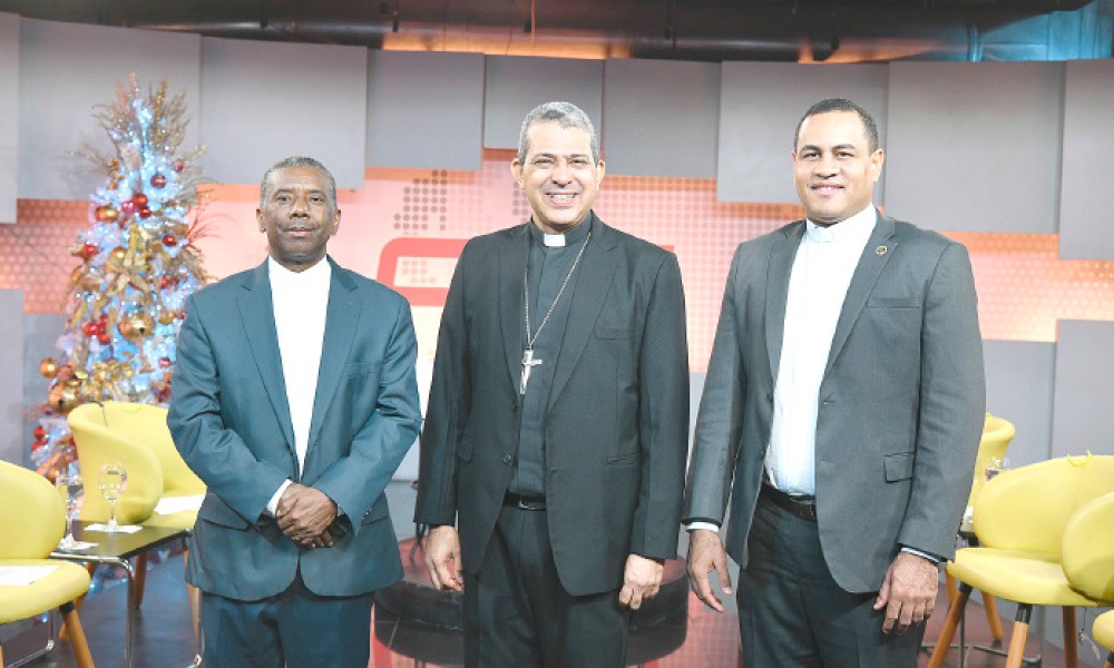 Al término del encuentro, monseñor Carlos Tomás Morel Diplán estuvo acompañado por los presbíteros Cecilio de los Santos y José Luis de la Cruz, quienes estuvieron presentes durante la visita al canal, aunque no participaron directamente en la entrevista.